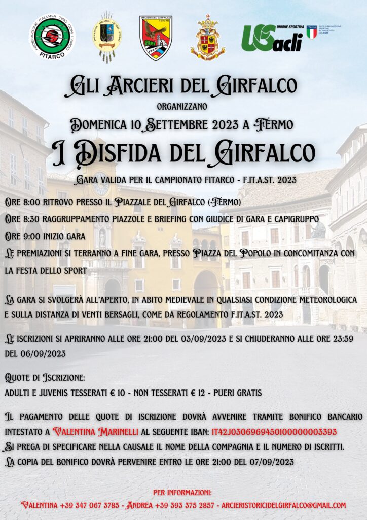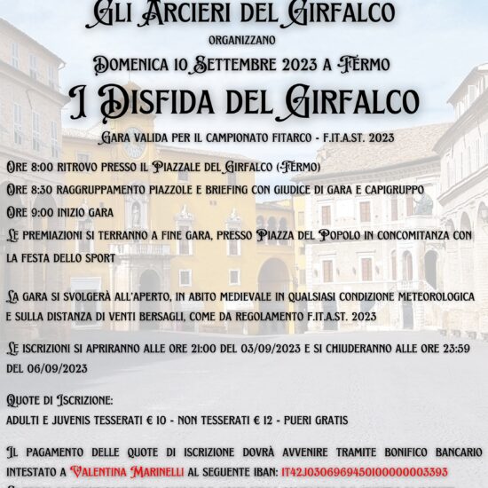 La gara si svolgerà all’aperto, in abito medievale in qualsiasi condizione metereologica e sulla distanza di venti bersagli, come da regolamento F.IT.A.ST. 2023