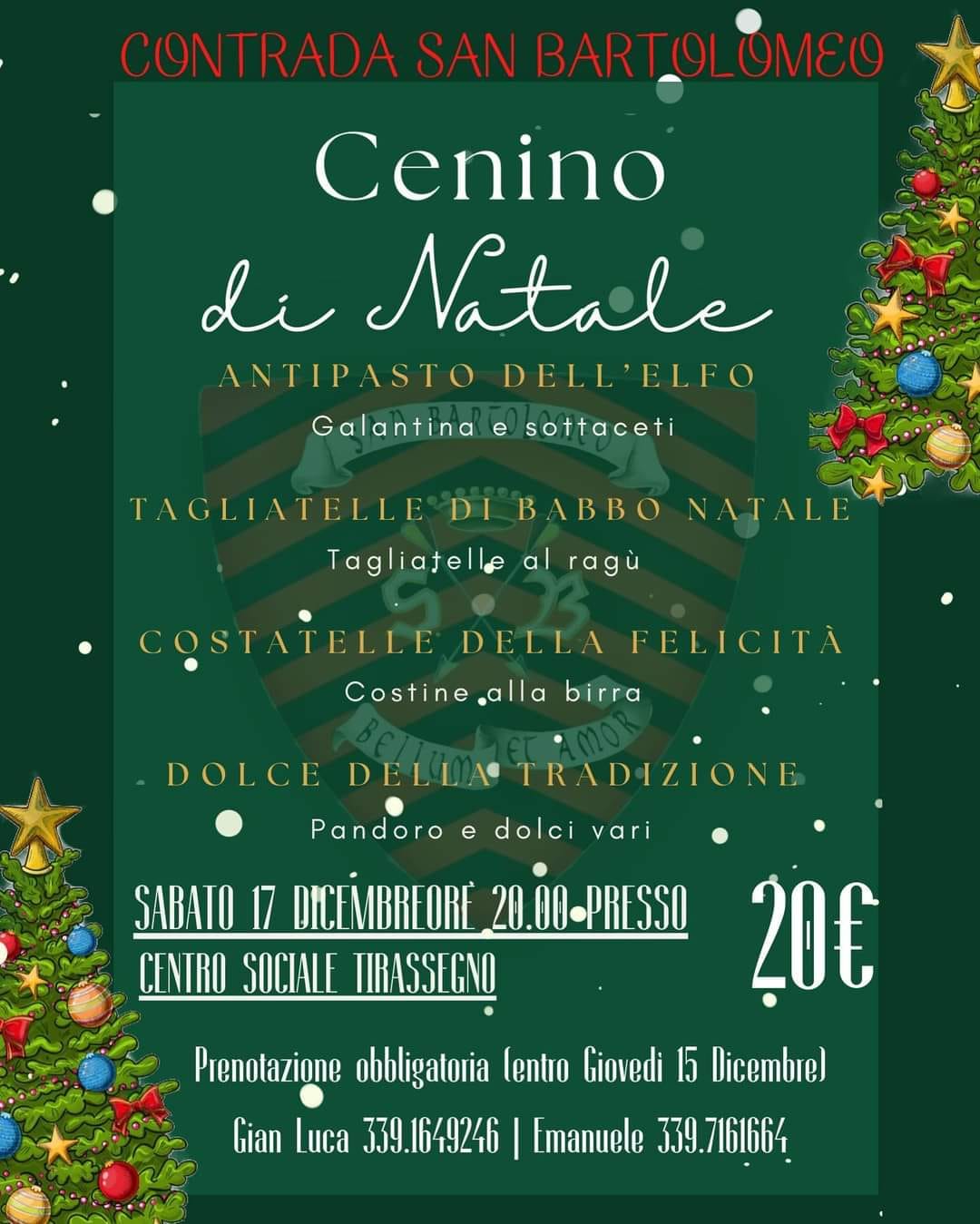 Addobbo dell'albero di natale presso la Chiesa di San Gabriele in collaborazione con la Scuola San Claudio. Ore 19.00 Messa del contradaiolo e a seguire cena di Natale presso il Centro Sociale Campiglione