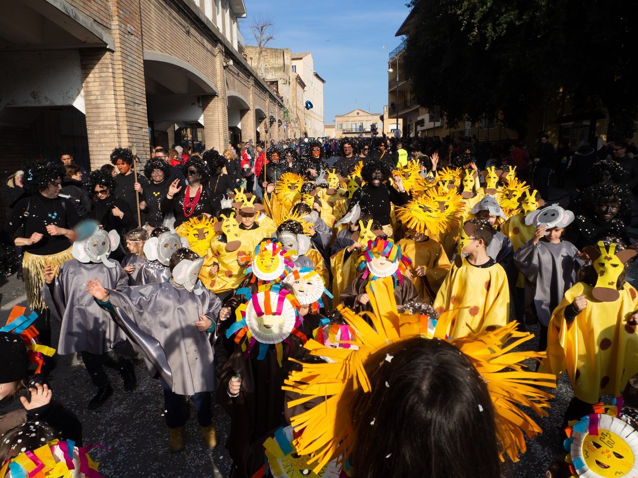 corteo di carri e gruppi mascherati, musica in piazza, premiazione dei gruppi e spettacolo finale