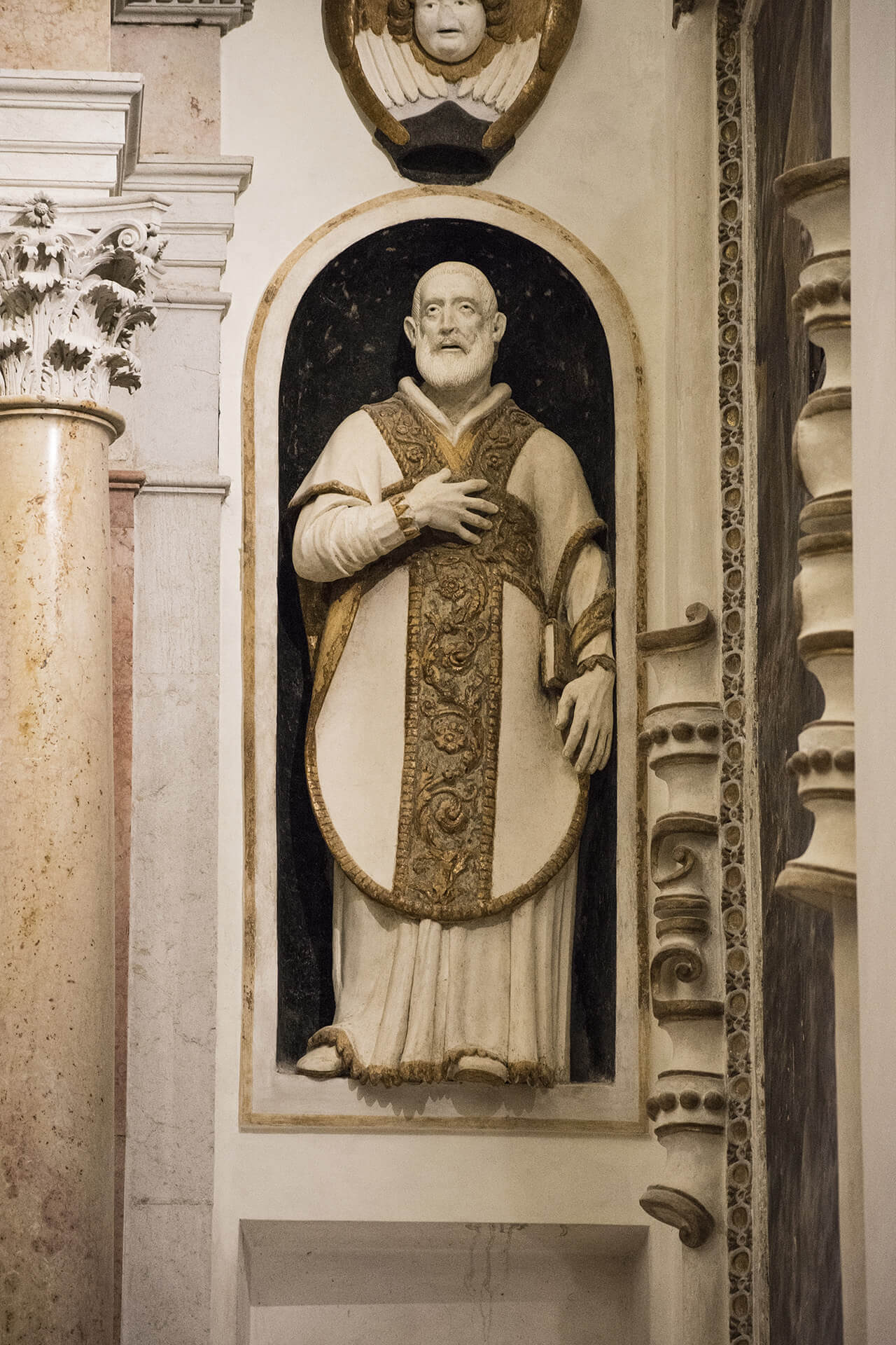 On 2 June 1607 the Church was consecrated and blessed together with the underlying Oratory by the Archbishop of Fermo Mons. Alessandro Strozzi. However, the building site went on with difficulty, also due to the numerous problems to the foundations and it was never completed in the façade, if not in the Doric order portal made of Istrian marble overlooking Corso Cavour. The door was made by Giovanni Mistichelli from Fermo, who above a gravestone of marble, topped by a cherub, says: “SPIRITUS SANCTUS / DIVO PHILIPPO NERIO VIVENTE / TEMPLUM HOC / ELIGIT / IN DOMUM ORATIRII”.