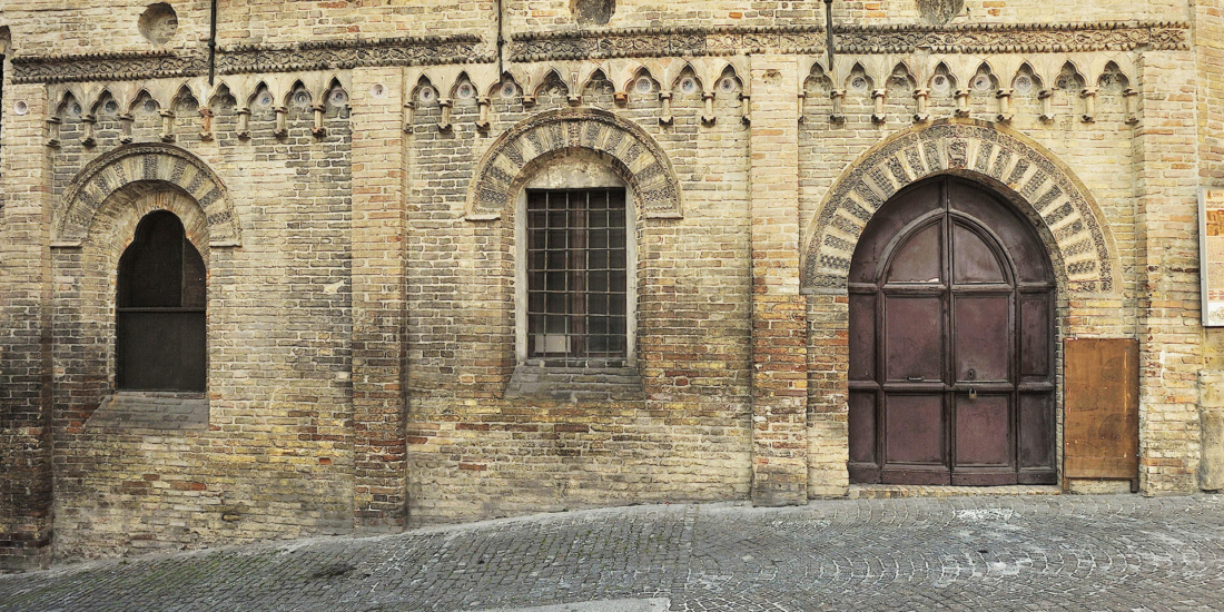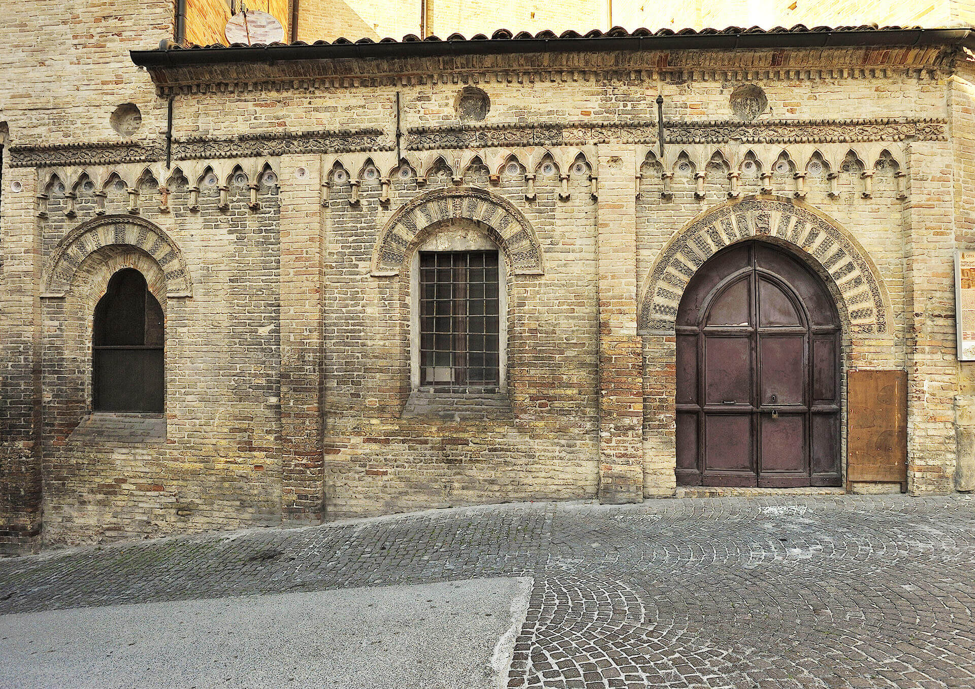 On the plaque set into the facade is written with gothic characters that the building was built between 1423 and 1425 by Giovanni di Guglielmo from Fermo. The simple architectural structure shows the most typical features of the measured and composed Gothic that characterizes the local architecture between the end of the fourteenth century and the beginning of the fifteenth. The simple gabled façade is crowned by a sequence of brick arches that frame the ceramic basins made by a central-Italian manufacturer of that time; further down there was a group of saints in majolica glazed with bright colors, today reduced to a few fragments.