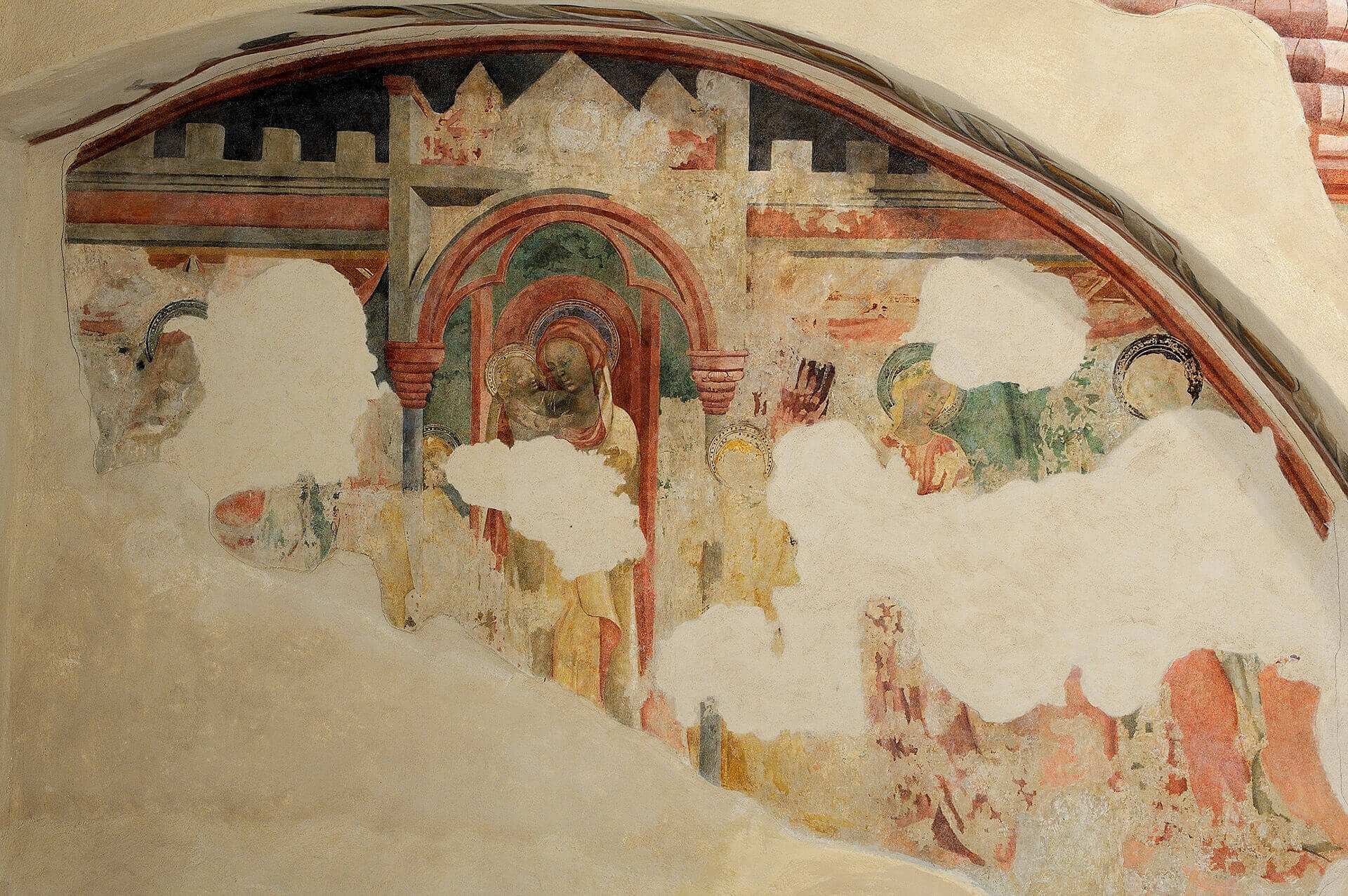 On the right side of the presbytery, there are some fragmentary frescoes of the ‘300 and’ 400 with the Eternal and Saints. on the left, in the area previously occupied by an old chapel, there are other frescoes of the second half of the 14th century, among which, above, Madonna della Misericordia and Saints, below, Annunciation, Crucifix, Eternal Father and two saints; next to the left side of the transept, the Annunciation and Marriage of the Virgin (1400). Along the left wall, in the first pillar Saints (1400) and on the next pillar the fifteenth century Madonna with Child and Saints; behind the second altar the fourteenth-century fresco with the Dormitio Virginis, followed by many frescoes from 1400.