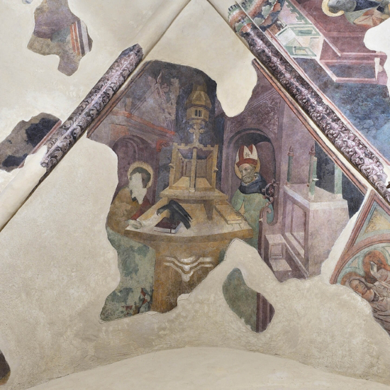 The St. Monica Oratory shows a quadrangular shape with a sail cover; it was decorated around 1430 with a cycle of frescoes that, to allow the rehabilitation of the wall structures, were torn from the walls twenty years ago. They were relocated and restored only in 1995.