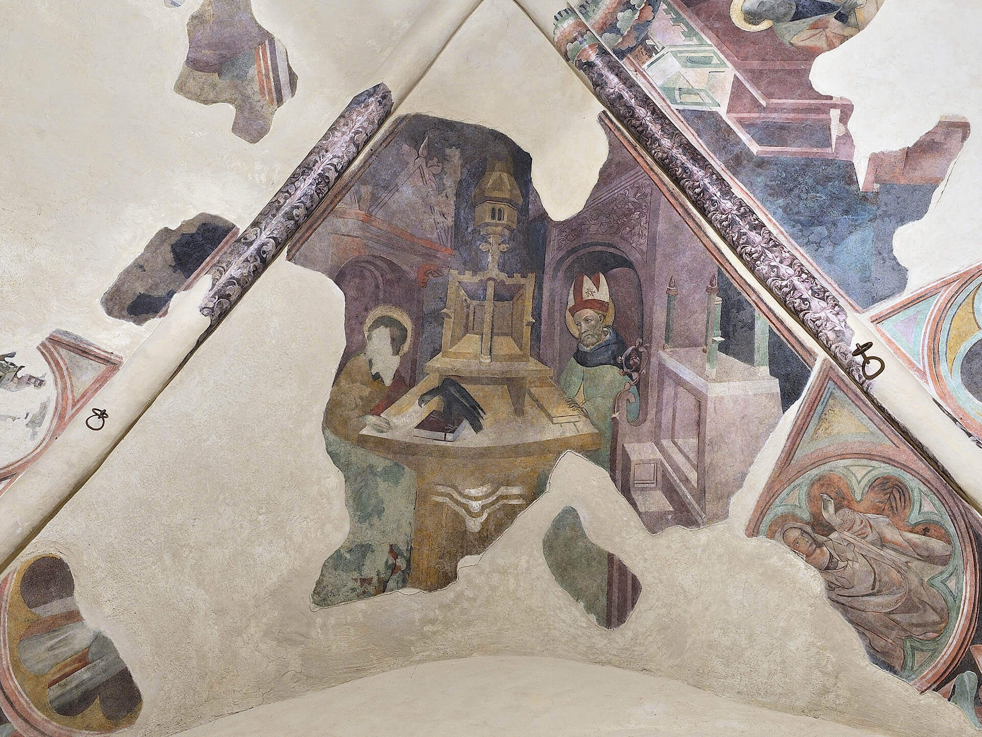 The attribution of these fascinating frescoes is still an intriguing problem for art historians: Pasquale Rotondi (1936) assigned them to Salimbeni brothers, a reference accepted by various scholars, until the same Rotondi in 1962 reported them to the master of Beata Serafina, noticing affinities with the style of Alberto Alberti.