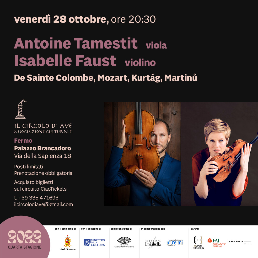 Antoine Tamestit viola Isabelle Faust violino musiche di De Sainte Colombe, Mozart, Kurtág, Martinů