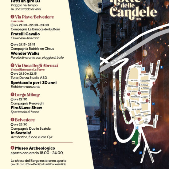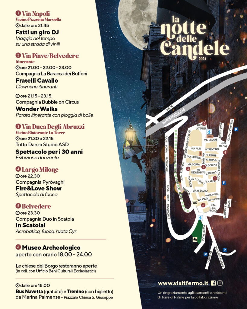- Dalle ore 18.00 Bus Navetta (gratuito) e Trenino (con biglietto) da Marina Palmense – Piazzale Chiesa S.Giuseppe