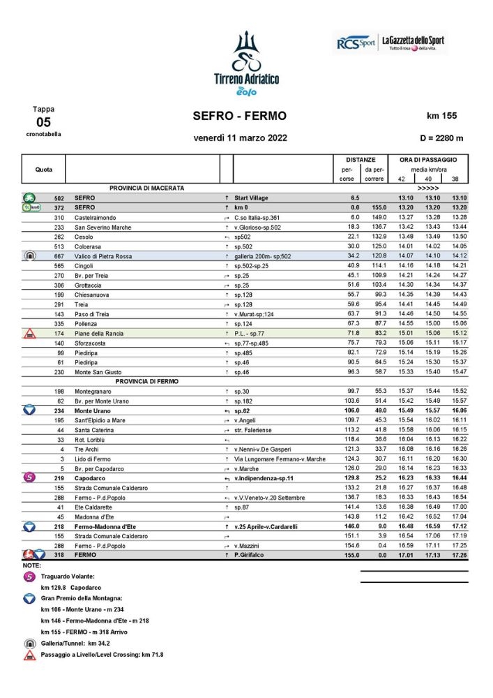 È la tappa dei Muri costituita da due parti distinte. La prima attraverso l’Appennino fino alle porte della provincia di Fermo e la seconda più articolata con 5 muri tra approccio all’arrivo e circuito finale.