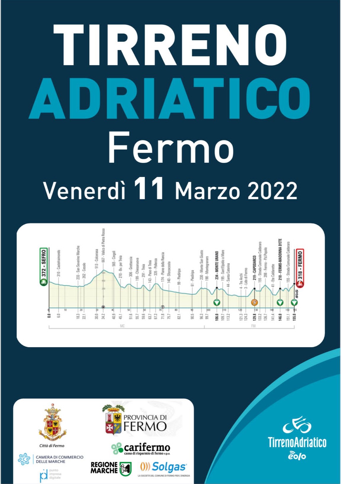 L’arrivo di tappa a Fermo di venerdì 11 marzo sul Girfalco rappresenta l’ingresso ufficiale nelle Marche della carovana dei 170 atleti che partecipano a questa edizione n. 57 della Tirreno Adriatico, dopo la partenza di lunedì scorso da Lido di Camaiore e l’attraversamento di Toscana e Umbria.