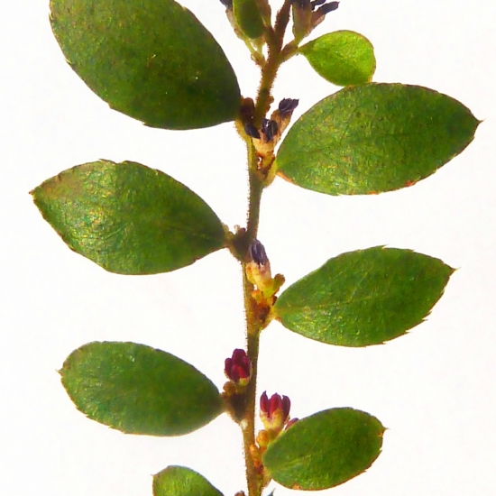 A Villa Vitali, tuttavia, è stata adottata una strategia alternativa. Invece di affrontare la piralide con trattamenti chimici, si è scelto di sostituire il bosso con il cosiddetto “falso bosso africano” (Myrsine africana L., Famiglia: Primulaceae, la famiglia delle primule). Questa specie, originaria dell’Africa, mostra una sorprendente somiglianza estetica con il bosso grazie a un fenomeno di convergenza evolutiva, occupando un ruolo ecologico simile. Entrambe le piante prosperano in habitat caldi e rocciosi: mentre il bosso è tipico delle nostre aree mediterranee, Myrsine africana è una specie caratteristica del Fynbos, la macchia mediterranea sudafricana (scoprine di più visitando l’aiuola M) e altre zone calde dall’africa all’India. Il nome deriva dalla sua somiglianza con il Mirto (Myrtus).
