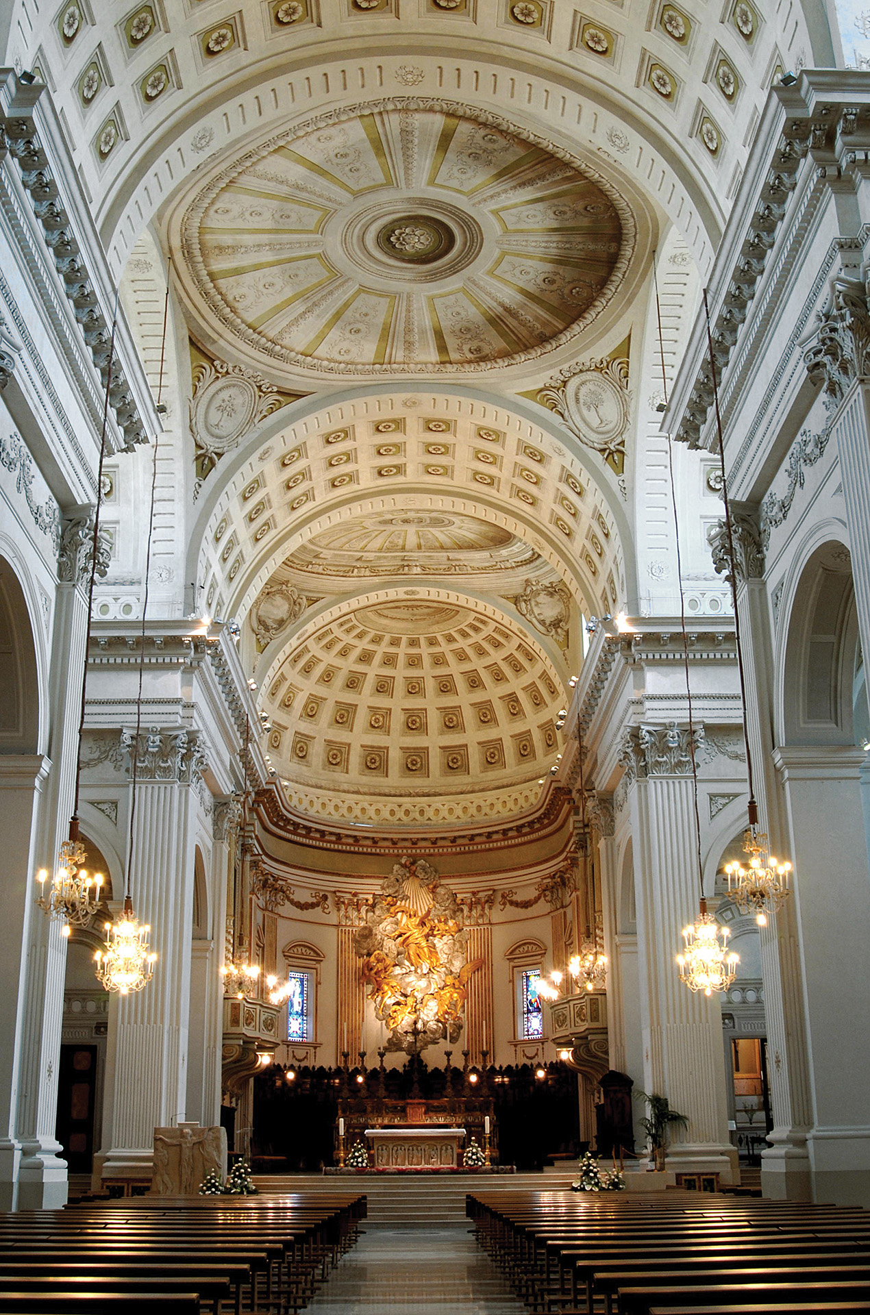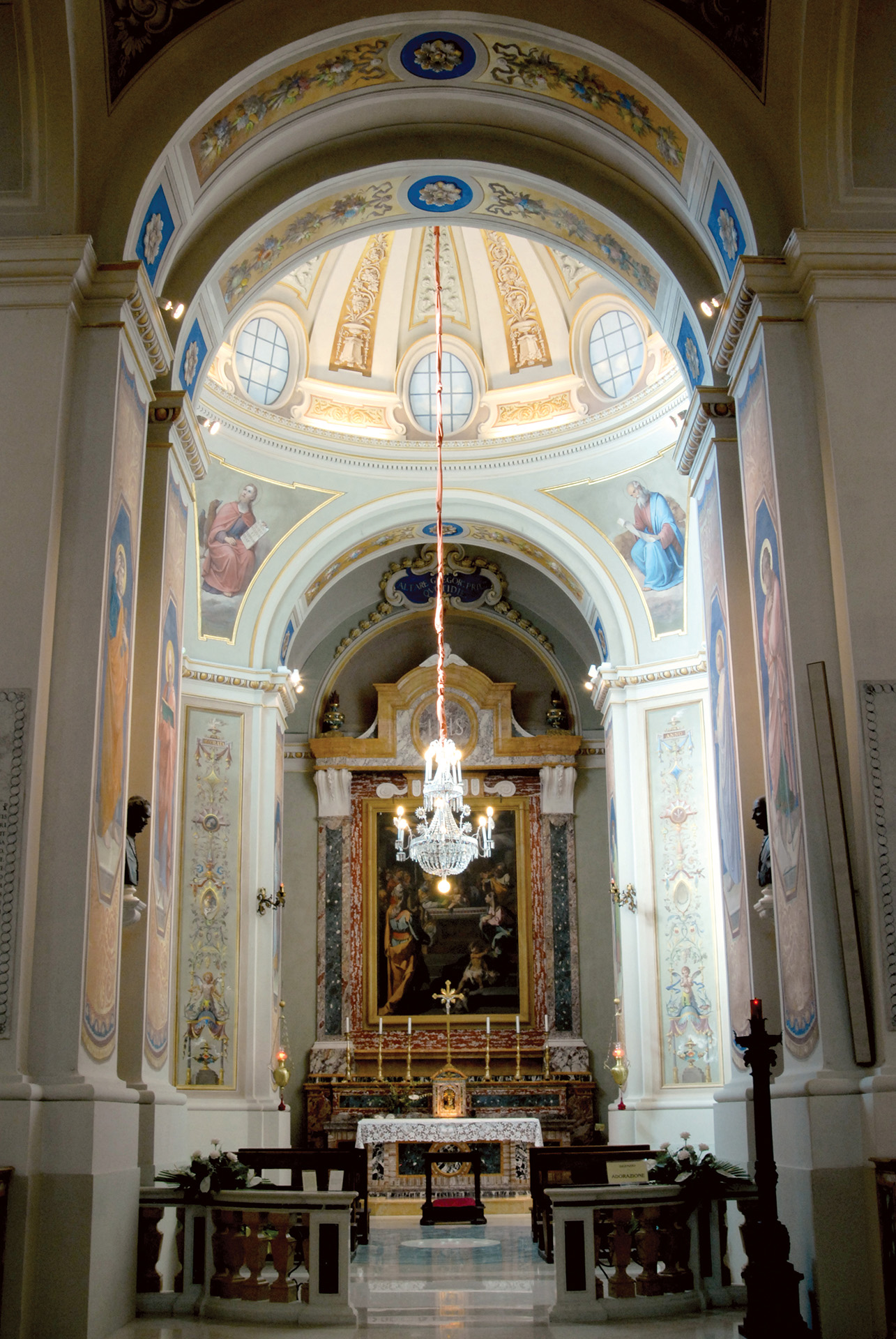 L’ambiente interno, al contrario della facciata, è fortemente caratterizzato dallo stile neoclassico. Appare suddiviso in tre navate delimitate da una serie di colonne che sorreggono la struttura sovrastante, formata da archi a tutto sesto con cupole dipinte.