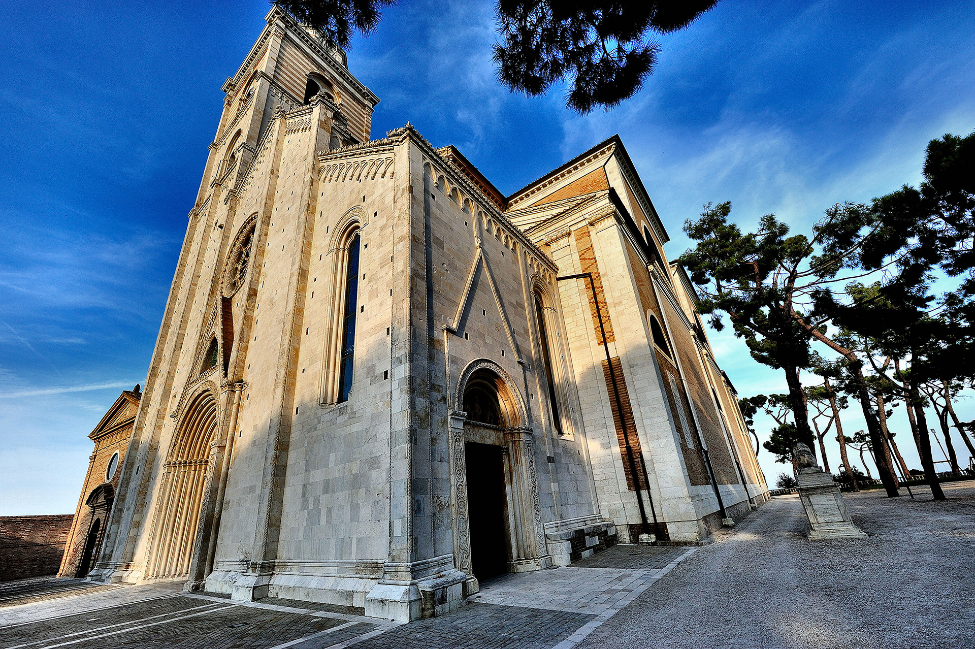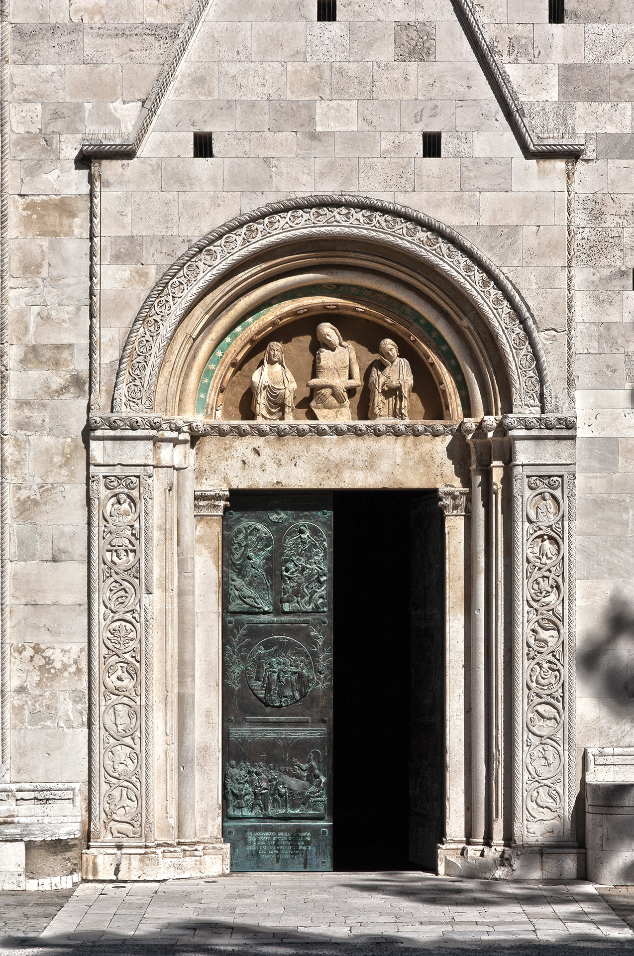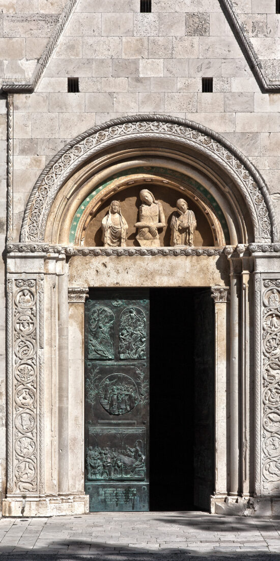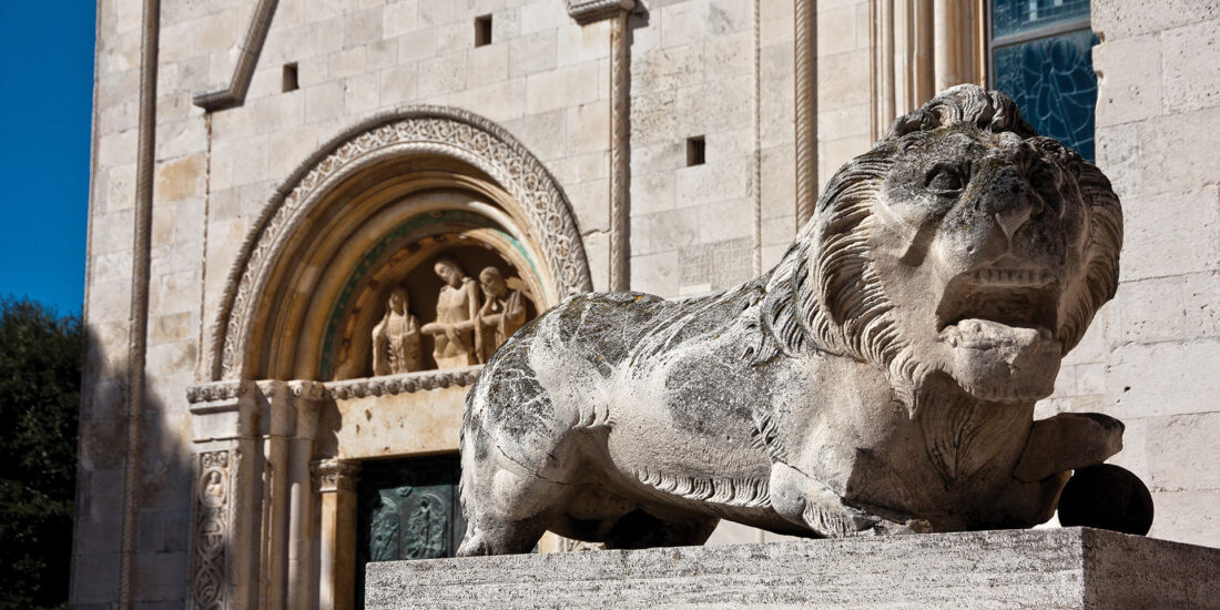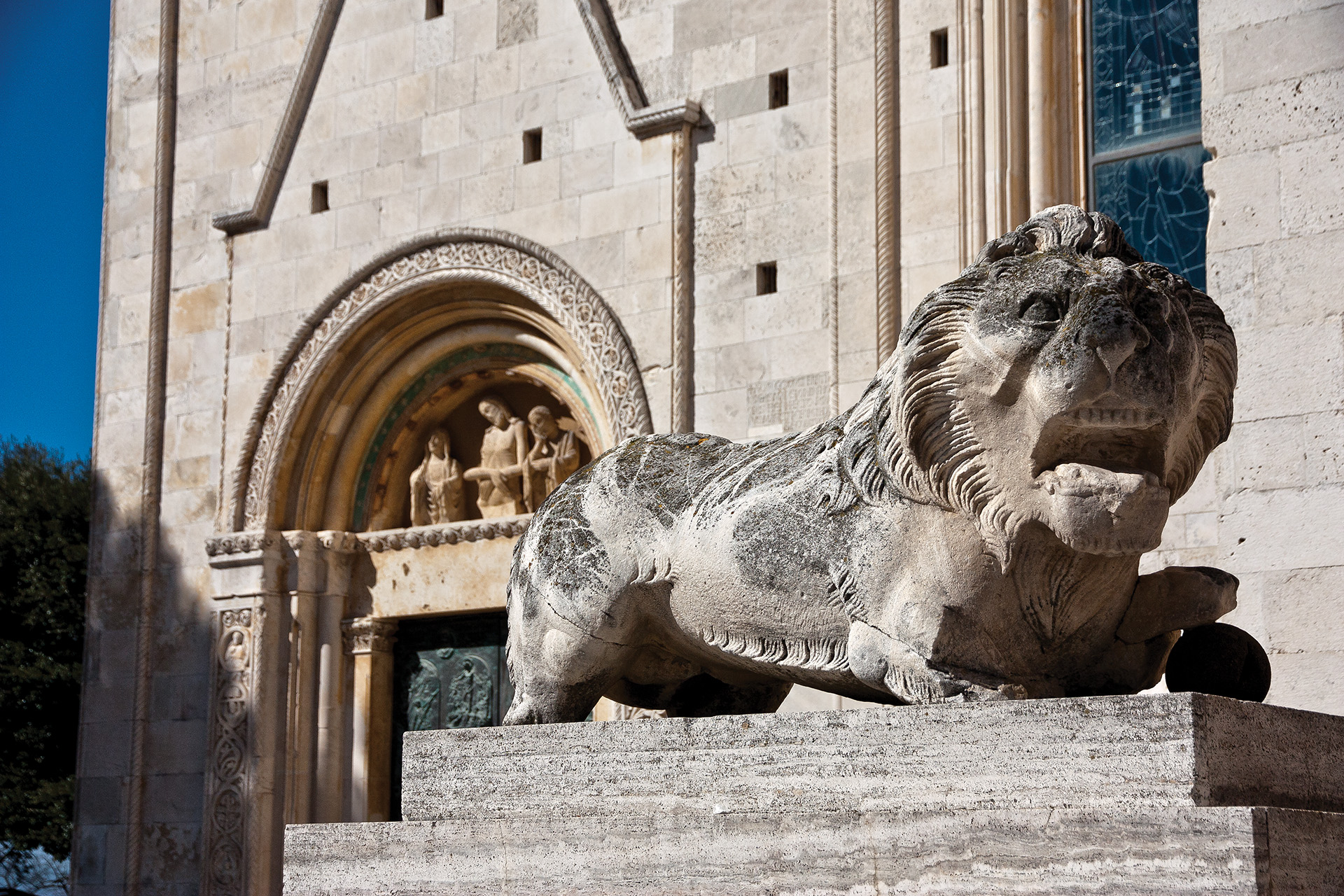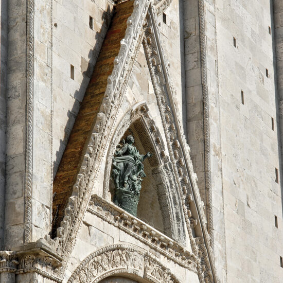 Fu suo nipote Federico II a volerne la ricostruzione nel 1227. Ancora oggi possiamo ammirarne la facciata originale in stile romanico-gotico: asimmetrica per via della torre campanaria che si trova sulla sinistra della basilica, presenta motivi cristiani ricorrenti scolpiti nella pietra d’Istria, come tralci di vite e grappoli che fuoriescono dalle fauci di un leone e un drago (che secondo l’esegesi biblica simboleggiano la salvezza dell’uomo continuamente ostacolata dal demonio).