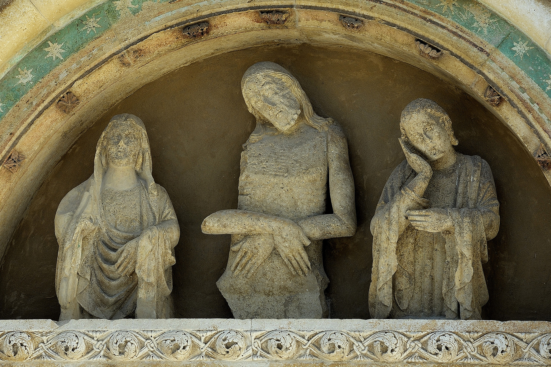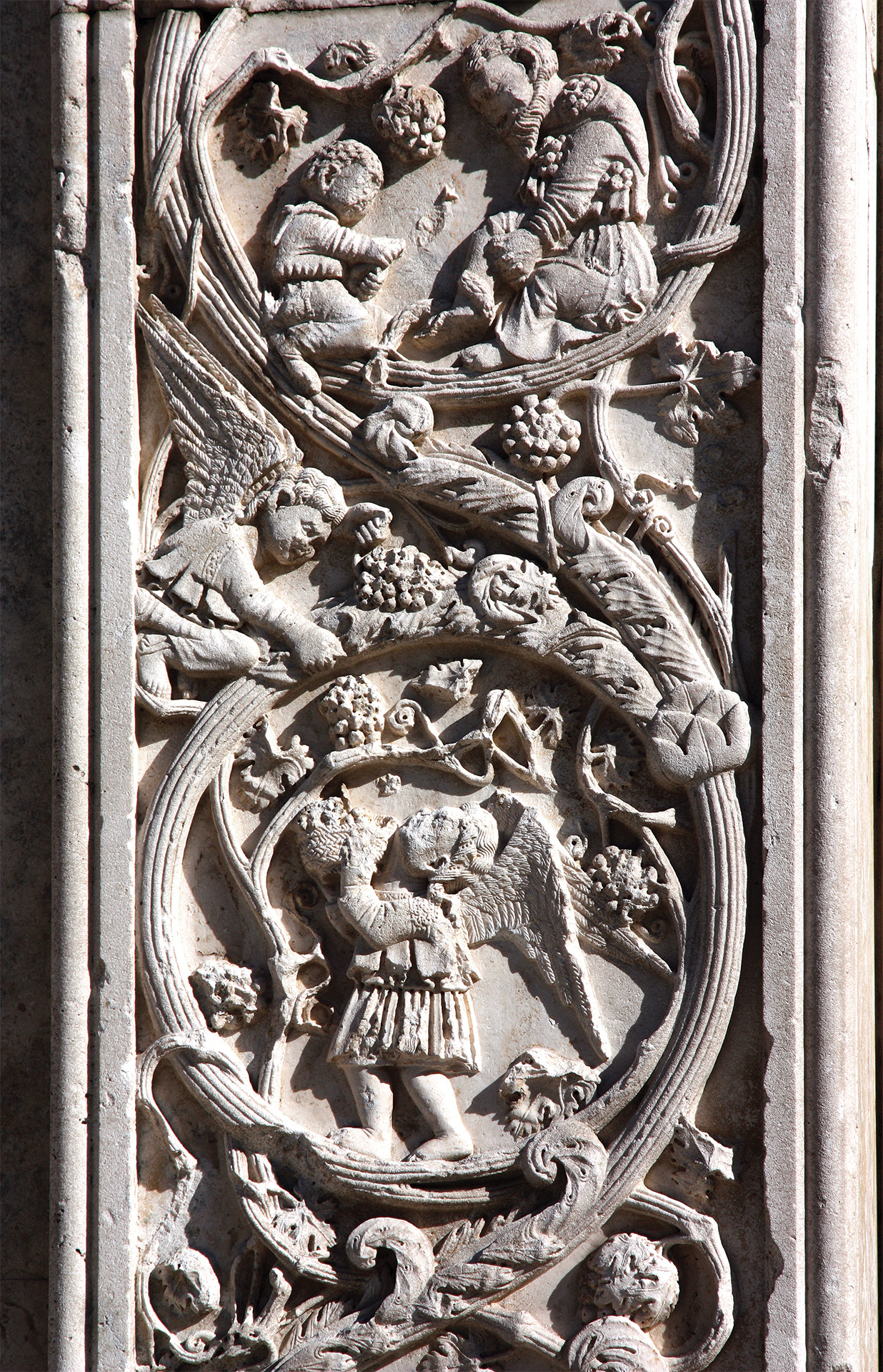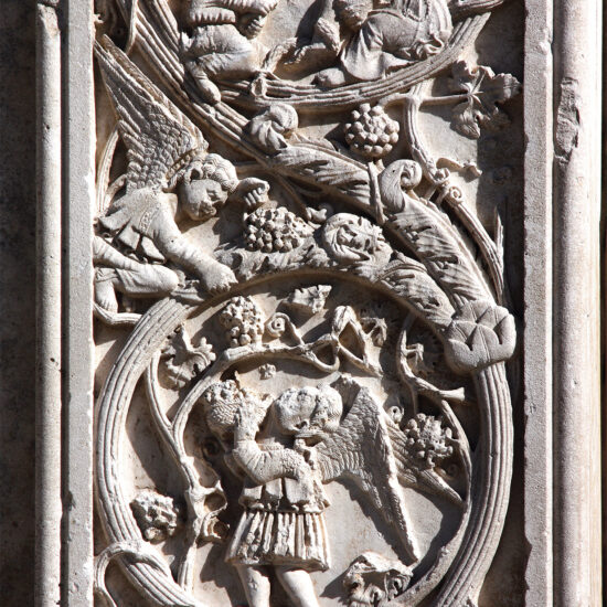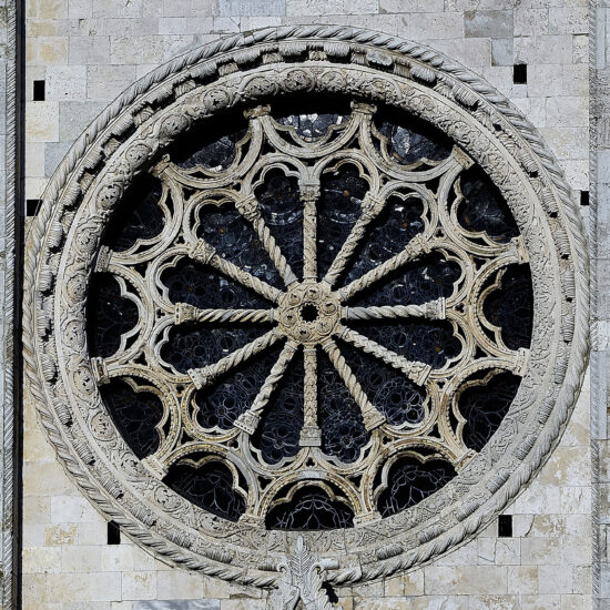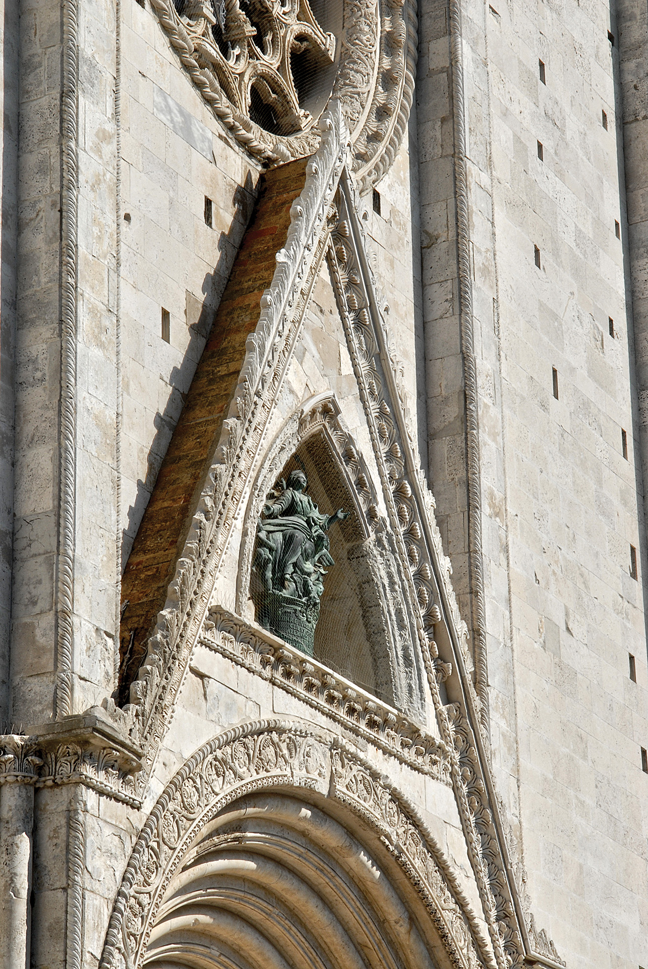 Fu suo nipote Federico II a volerne la ricostruzione nel 1227. Ancora oggi possiamo ammirarne la facciata originale in stile romanico-gotico: asimmetrica per via della torre campanaria che si trova sulla sinistra della basilica, presenta motivi cristiani ricorrenti scolpiti nella pietra d’Istria, come tralci di vite e grappoli che fuoriescono dalle fauci di un leone e un drago (che secondo l’esegesi biblica simboleggiano la salvezza dell’uomo continuamente ostacolata dal demonio).