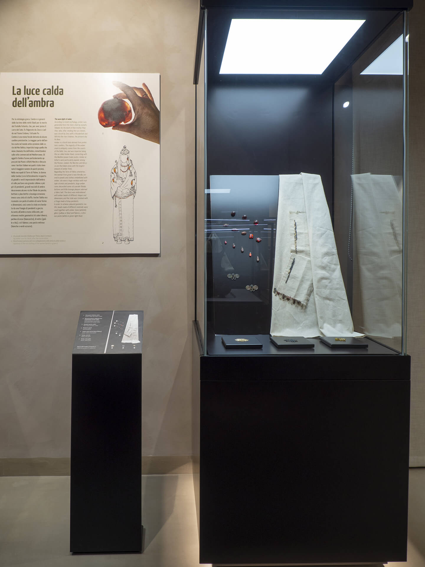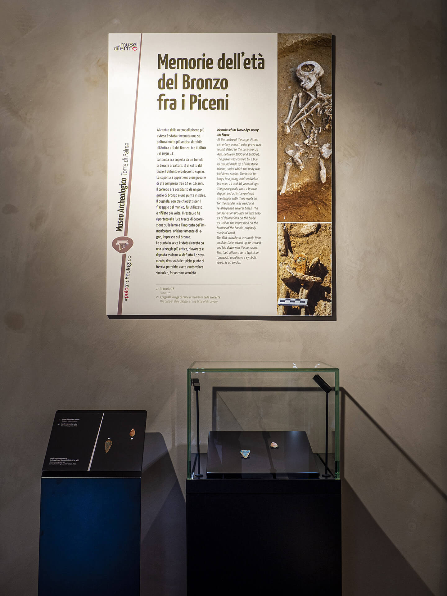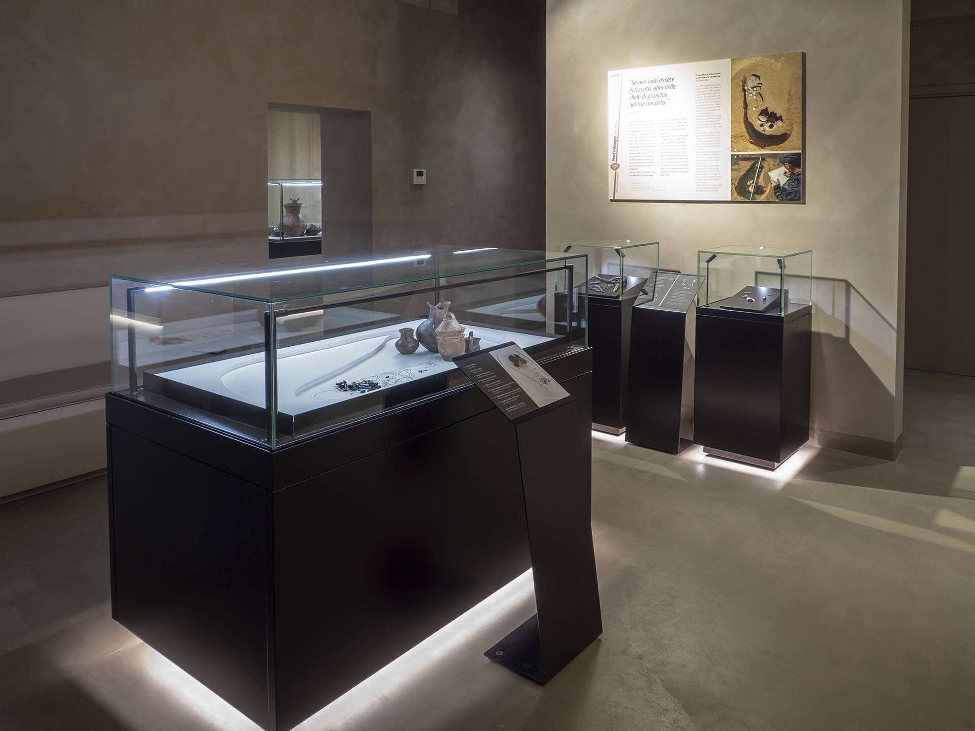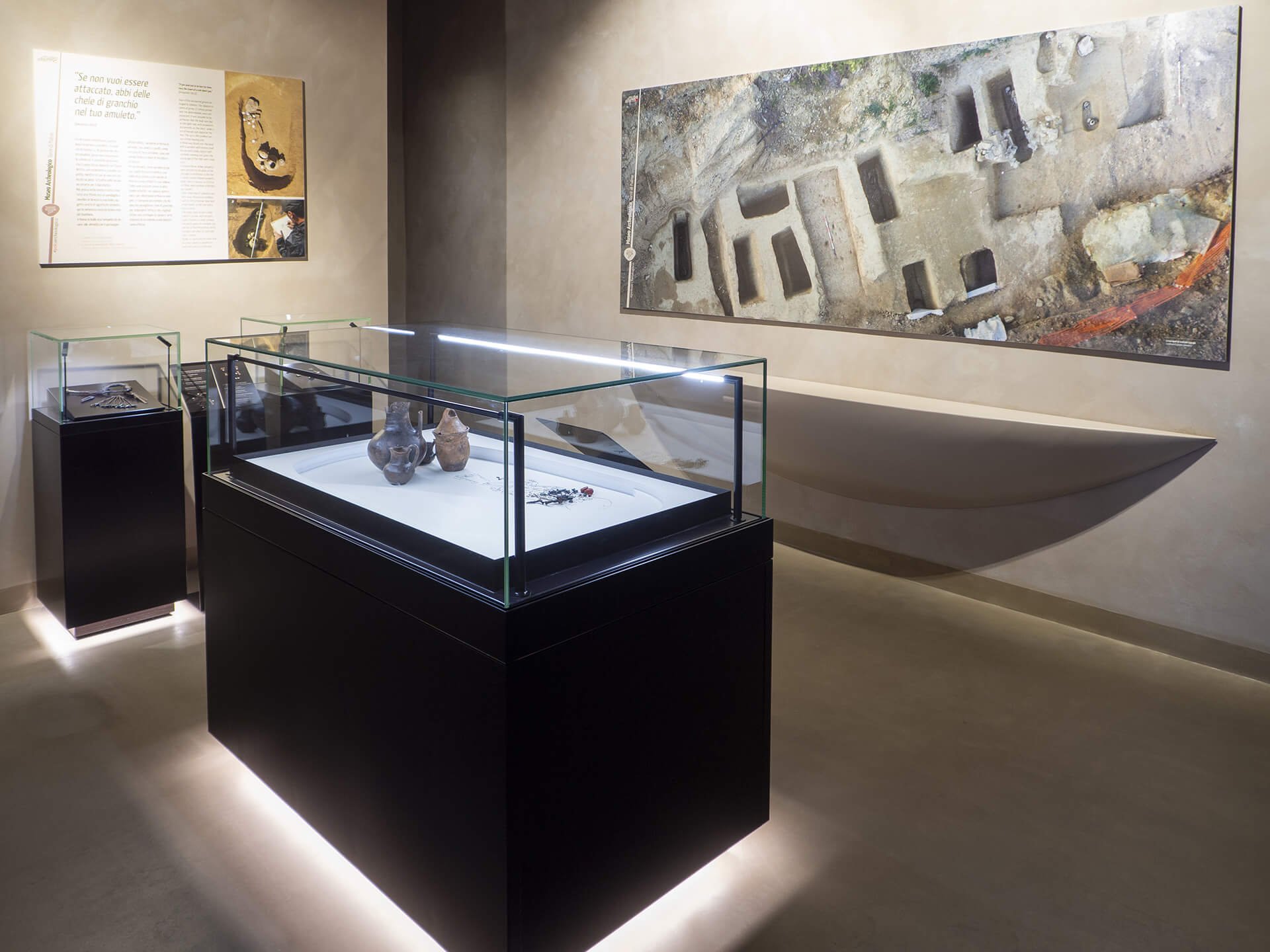 Nella prima sala, dove hanno sede anche il punto informativo turistico e la biglietteria, è esposta la tomba più antica della necropoli, risalente all’età del bronzo (IX-VII secolo a.C.), di un giovane, di età compresa tra i 17 e i 21 anni, sepolto con il suo piccolo corredo: un pugnale in lega di rame e un manufatto in selce.