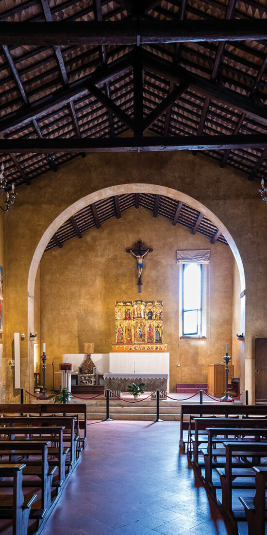 L’edificio religioso conserva, sull’altare, un pregevole polittico di Vittore Crivelli realizzato alla fine del ‘400. Una profusione di colori smaltati, vivificati dall’oro dei fondi, definisce le icastiche immagini dei Santi schierati su due ordini ai lati del trono sul quale siedono la Vergine con il Bambino. La cornice originale in legno intagliato e dorato ancora unisce le varie tavole dipinte, formando un insieme coerente, spazialmente scandito secondo il ritmo disteso e pacato che ribadisce il tono malinconico dei volti. Altro dipinto degno di nota è la pala del pittore locale Vincenzo Pagani, realizzata alla fine del ‘500 e situata sulla parete destra della chiesa, raffigurante, in colori vividi ed intensi, una Madonna in trono con Bambino e Santi.