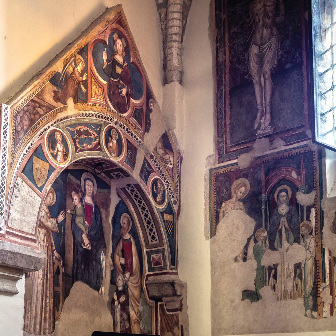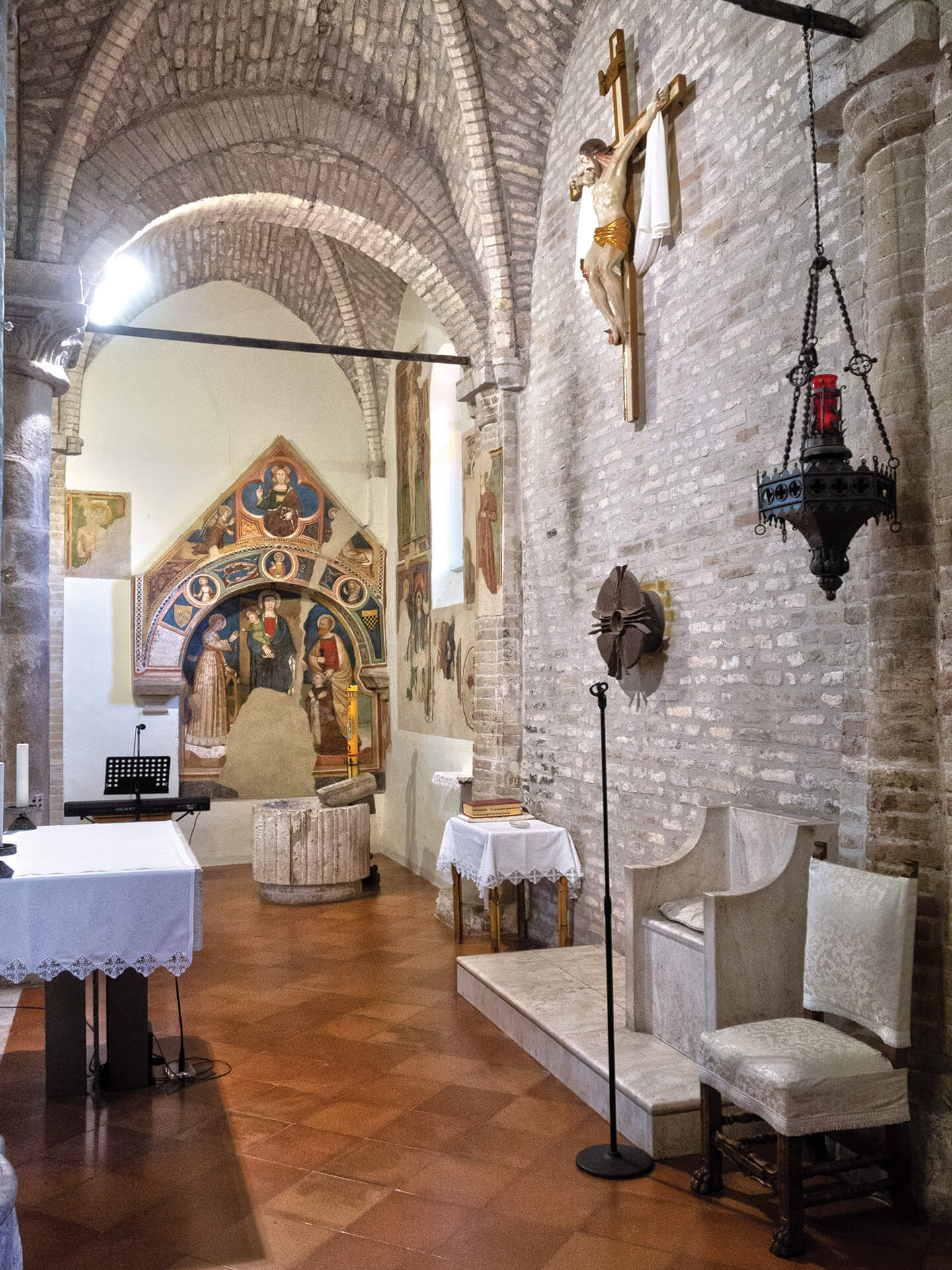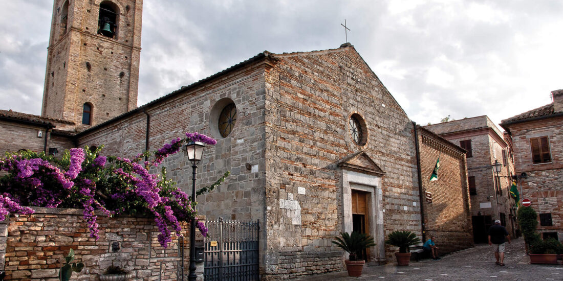 La chiesa di Santa Maria a Mare risale al milleduecento quando venne costruita dagli Eremiti di Sant’Agostino. Le vicende architettoniche di questo edificio hanno avuto alterne vicissitudini nel corso della storia, fino ad arrivare all’attuale struttura che è il risultato dell’unione di tre chiese preesistenti. L’ingresso principale, su piazza Lattanzi, fu traslato su uno dei lati dell’antica chiesa in epoca secentesca ed è costituito da una sobria facciata in mattoni e pietra arenaria, dove un semplice portale con timpano triangolare è sovrastato da un modesto rosone. Il bel campanile è originario dell’edificio duecentesco.
