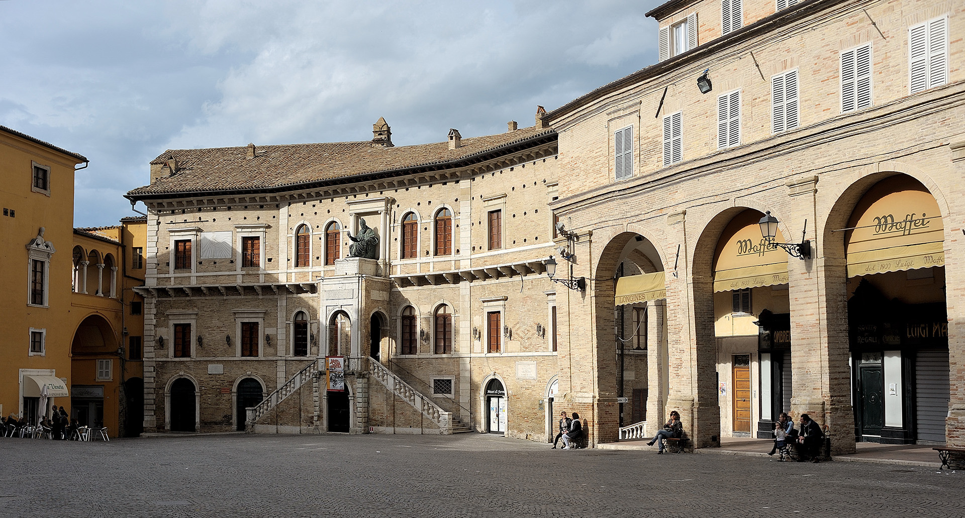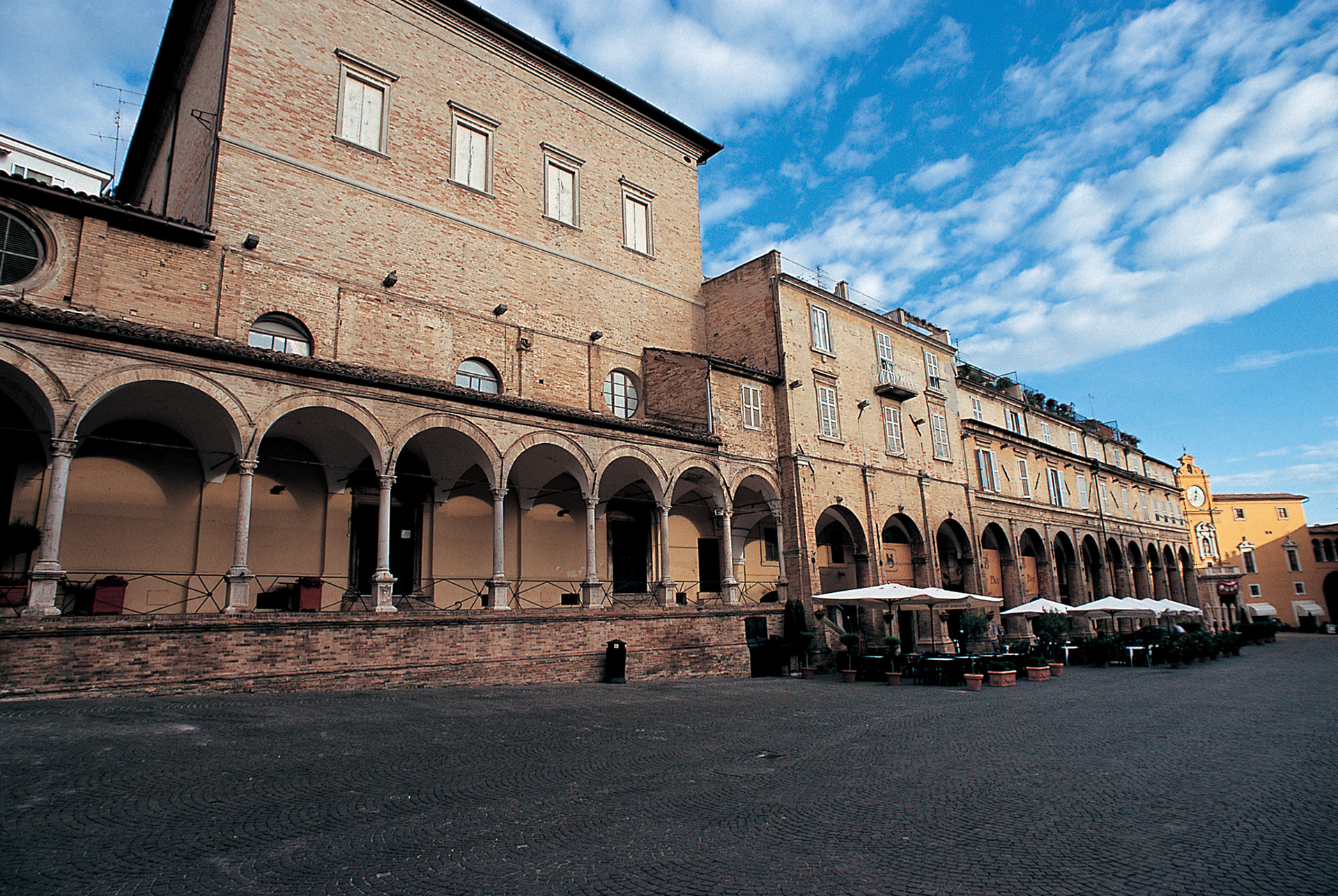 La piazza si presenta ai suoi avventori delimitata da due lunghe file di logge, con portici in cotto, e chiusa ai lati più corti da importantissimi edifici storici: il Palazzo dei Priori, nato nel 1296 dall’unione di un palazzo nobiliare del XIII secolo e di un’antica chiesa, che ospita oggi la Pinacoteca civica di Fermo; il Palazzo apostolico, opera risalente ai primi decenni del XVI secolo, iniziato per volere di Oliverotto Euffreducci e concluso per ordine di Papa Clemente VII, il loggiato di San Rocco, realizzato nel 1528 e sede della chiesetta di San Martino, edificata a sua volta nel 1505 quale risposta religiosa alla terribile pestilenza che falcidiò l’Europa per ben due secoli dal 1400 al 1600.