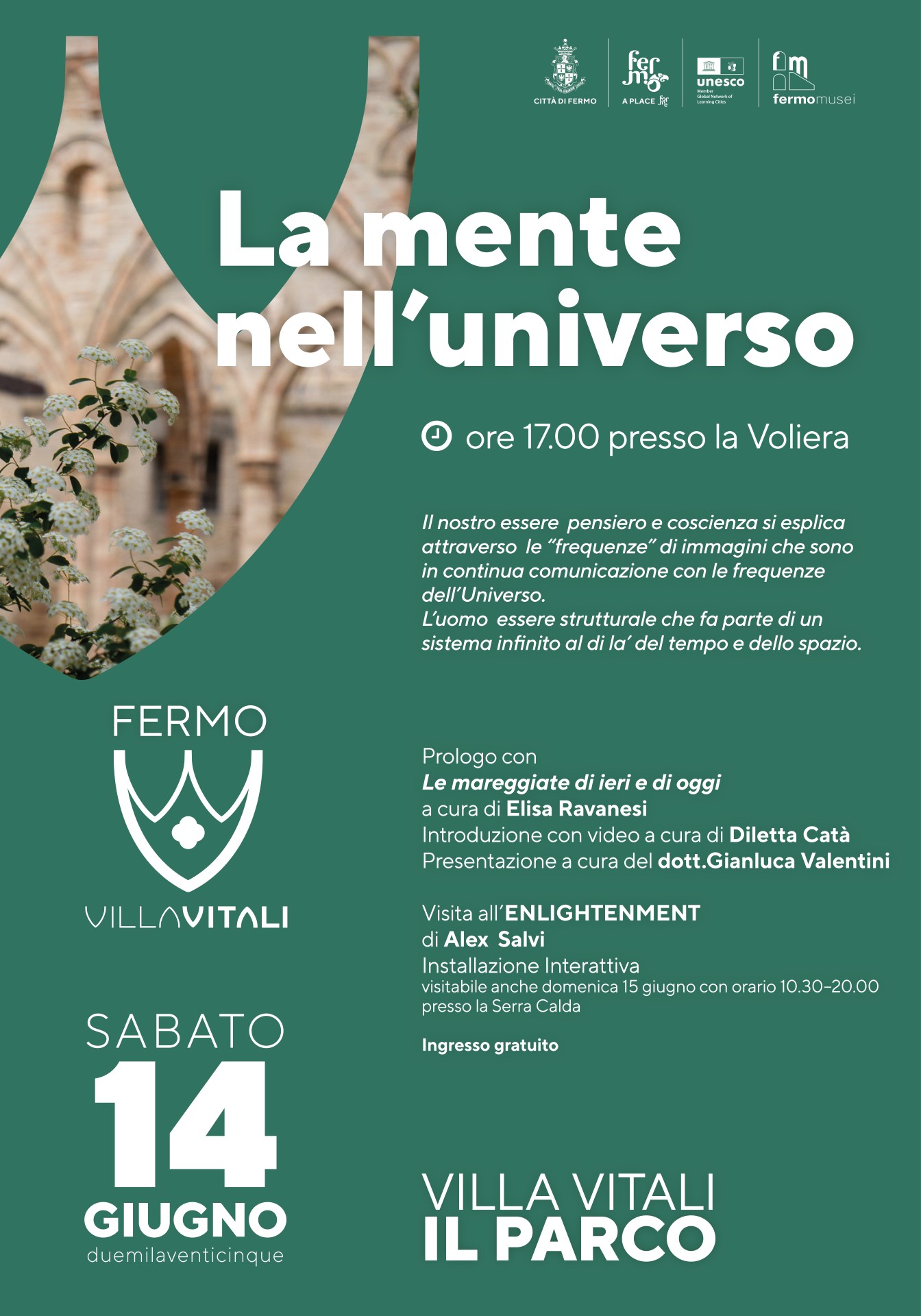 Il nostro essere pensiero e coscienza si esplica attraverso le “frequenze” di immagini che sono in continua comunicazione con le frequenze dell’Universo. L’uomo essere strutturale che fa parte di un sistema infinito al di la’ del tempo e dello spazio. Prologo con “Le mareggiate di ieri e di oggi” a cura di Elisa Ravanesi Introduzione con video a cura di Diletta Catà Presentazione a cura del dott.Gianluca Valentini Visita all’ ENLIGHTENMENT di Alex Salvi - Installazione Interattiva
