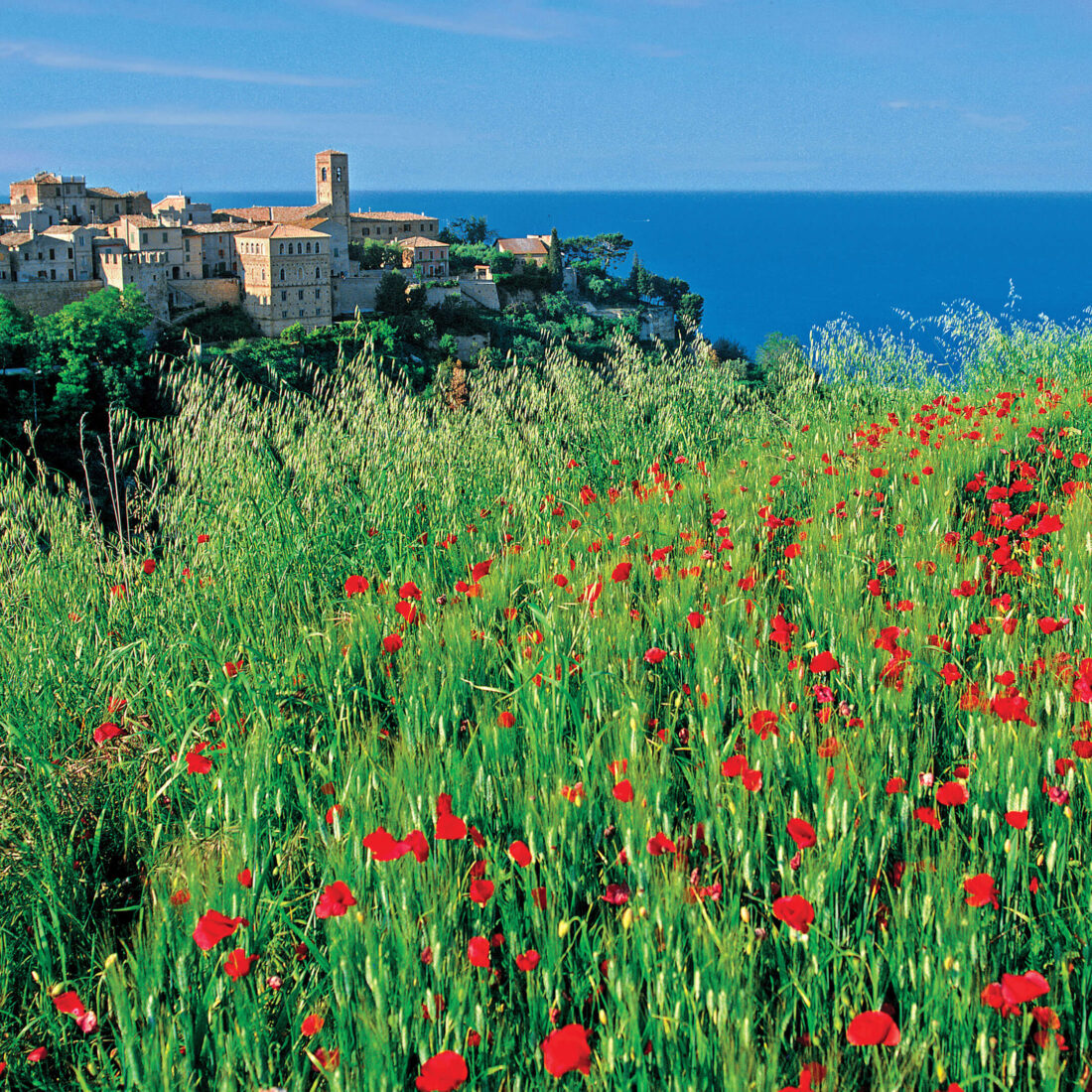 La città può vantare due vere e proprie quinte naturali: da un lato il Mare Adriatico, distante solo otto chilometri dal centro urbano, e dall’altro lo scenario suggestivo di un entroterra di cittadine tipiche, borghi vicino Fermo che si spingono con un dolce paesaggio collinare fino alle pendici dei “monti azzurri” di leopardiana memoria: i Sibillini.