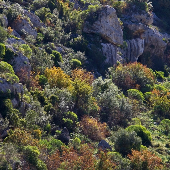 Le piante mediterranee affrontano la siccità estiva con adattamenti come radici profonde, foglie coriacee o coperte di peli, e l’estivazione, per esempio in Euphorbia dendroides. Molte specie annuali crescono in primavera e sopravvivono all’estate come semi. In questa aiuola troviamo specie come Cistus e Phlomis fruticosa, tipiche del bacino mediterraneo. Il Monte Conero segna il limite settentrionale del clima mediterraneo lungo l’Adriatico italiano.